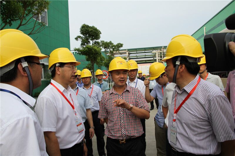 8月17日,由紹興市委書記陳金彪(左三)帶隊的督查組到閏土生態工業園內的閏土新材料公司督查安全生產工作。陳金彪書記一行深入生產一線,了解企業?;返膬Υ?、使用情況,詳細詢問了?;返奈锢砘瘜W特征、緊急處置辦法和應急預案,并聽取了企業負責人關于生產工藝流程的介紹。陳書記對閏土新材料公司的安全生產和?;饭芾砉ぷ鞅硎菊J可,并囑咐企業一定要時刻緊繃安全生產這根弦,企業在抓效益的同時,更要抓好安全、環保工作。紹興市副市長楊文孝、紹興市上虞區區委書記孫云耀、紹興市上虞區區委常委、杭州灣上虞經濟技術開發區管委會主任胡文煒、紹興市上虞區副區長王永表等領導,閏土股份副董事長阮加春、閏土股份副總經理阮光棟、閏土新材料公司總經理周杰文等一起陪同。